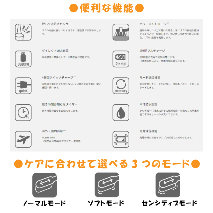 ※3 通常の押しつけ力で磨いた場合、常にブラシ振幅を維持するようパワー制御します。強い押しつけ力で磨いた場合、ブラシ振幅を抑制する磨きすぎ防止機能付き。