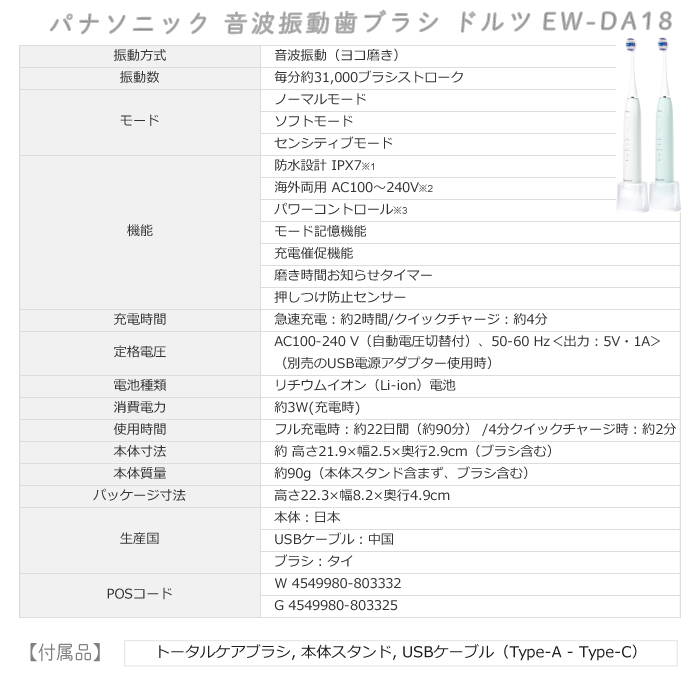 パナソニック 音波振動歯ブラシ EW-DA18 ドルツ Doltz 電動歯ブラシ