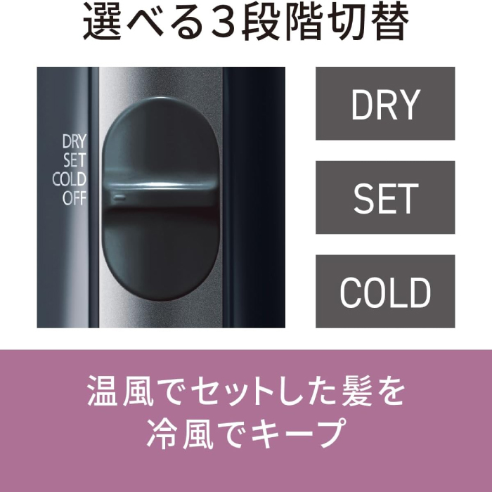 選べる3段階切替で、温風でセットした髪を冷風でキープする、プロのテクニックが簡単に。