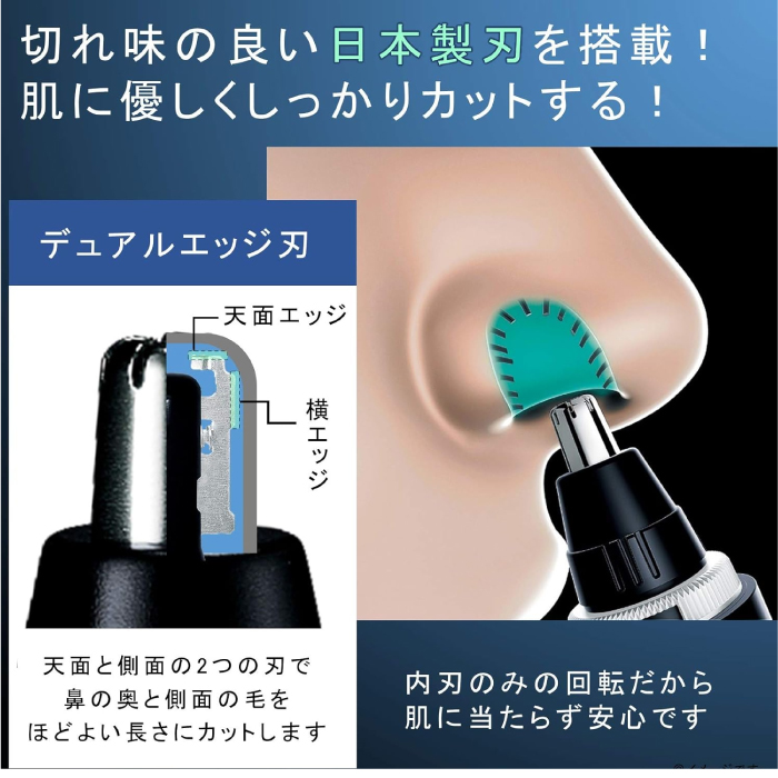 「デュアルエッジ刃」で鼻の奥と側面の毛を同時にカット