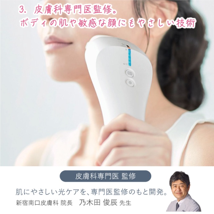 本体フィルターとダブルで刺激をカットするので、デリケートな顔もやさしくお手入れ。(※顔のお手入れ時には、必ずフェイス用アタッチメントをご使用ください) スキンセンサーが、肌の色にあわせたおすすめの出力レベルを自動で検知するので、初めてでも安心して使用可能。