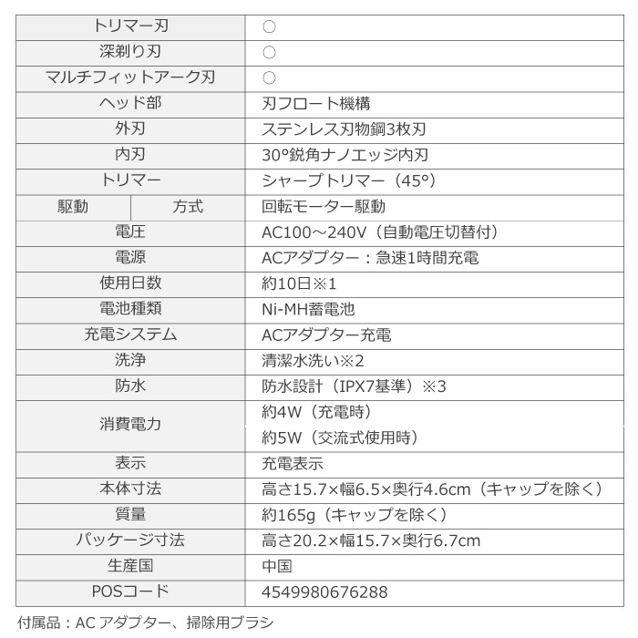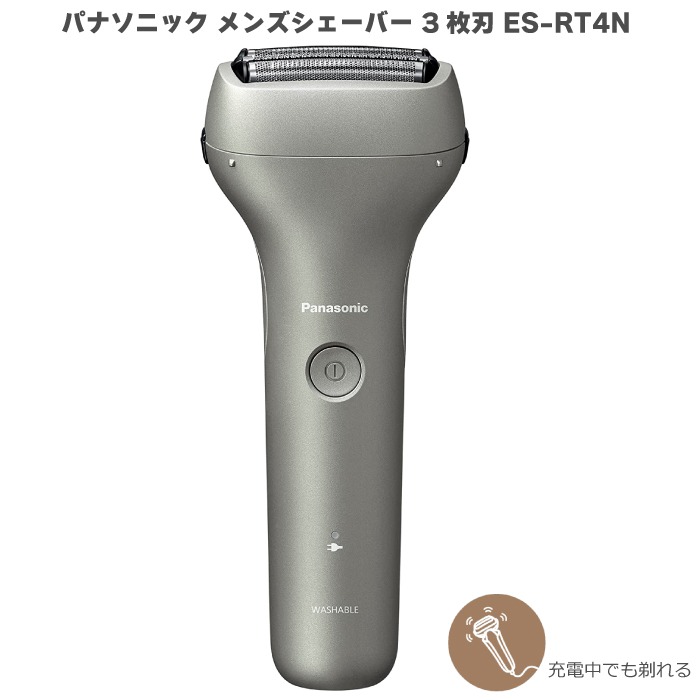 ※以下、ページ内の一部で「ES-RT4AU-A(青)」をイメージとして使用しています。本ページは「ES-RT4N-S(シルバー色)」の販売ページですのでご注意ください※ 「エントリーシェーバー 3枚刃 ES-RT4N」 おすすめポイント 充電中でも剃れる※1/1時間急速充電/海外・国内両用AC 100-240V※2/防水設計 IPX7基準※3/本体丸ごと清潔水洗い※