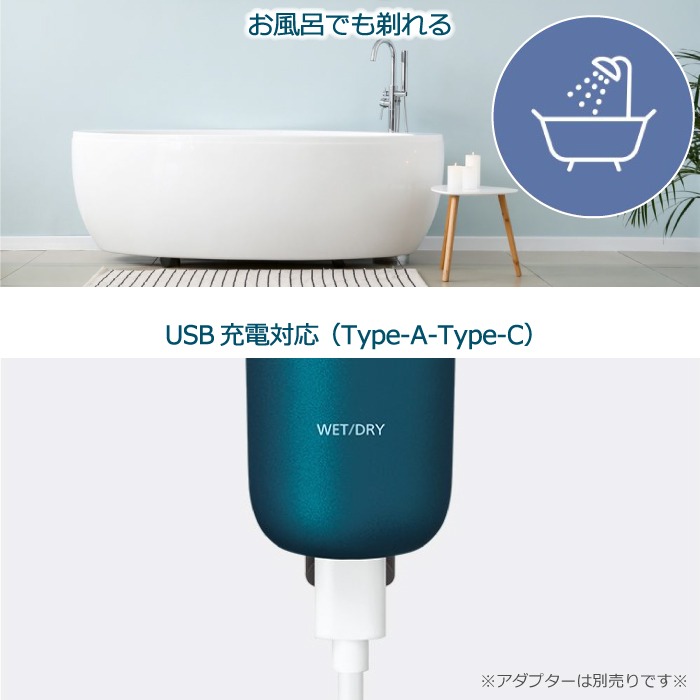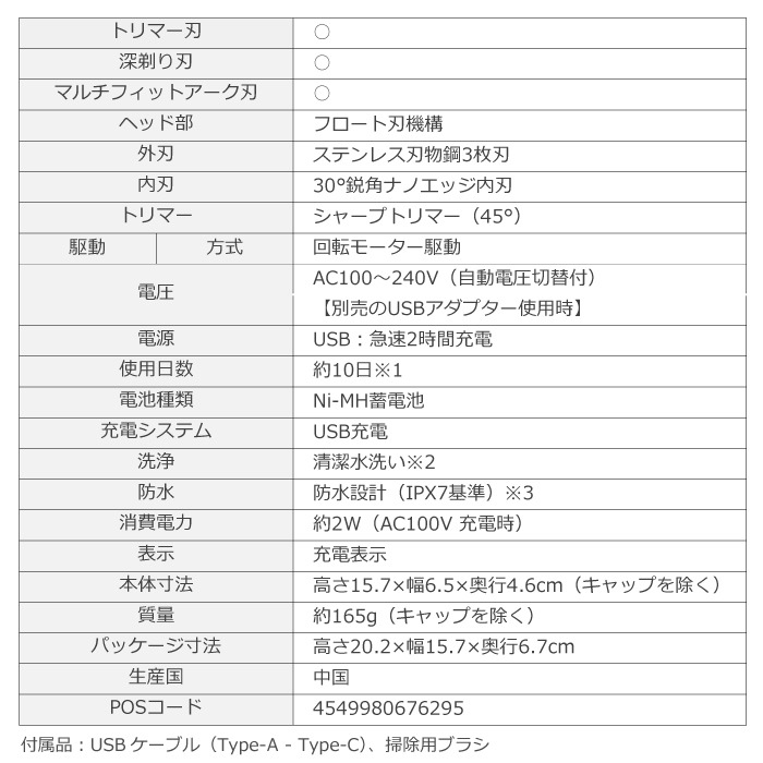 なめらかな剃り心地。急速2時間充電対応。持ち運びに便利なUSB充電タイプ。