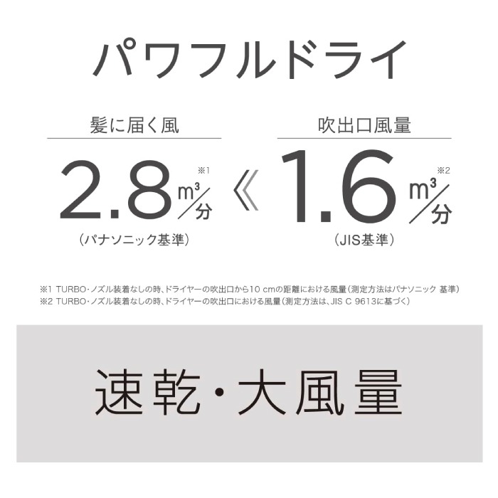 1.6m³/分※1パナソニック基準2.8m³/分※2の大風量で速乾します。周りの風を巻き込みながら増幅するので、大風量が髪に届きます。