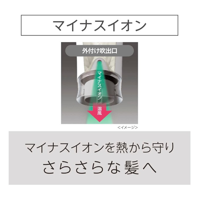 ポイント2. 「マイナスイオン」がしっかり髪に届いてサラサラな髪へ。※3 温風とマイナスイオンの吹出口を分け、マイナスイオンに含まれる水分をドライヤーの熱から守る外付けマイナスイオン搭載。マイナスイオンが髪表面をコートして、さらさらな髪に。さらに、髪の静電気も抑制します。