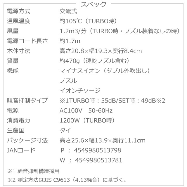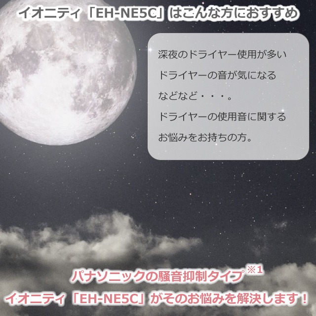 TURBO時…55dB / SET時…49dB※2の騒音抑制構造、抜群のコストパフォーマンス、マイナスイオン搭載、イオンチャージパネル搭載の「EH-NE5C」