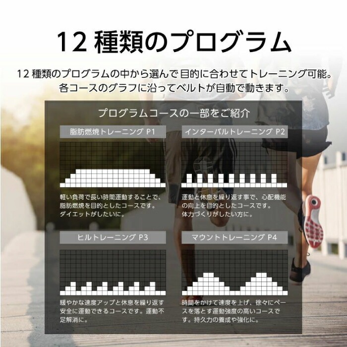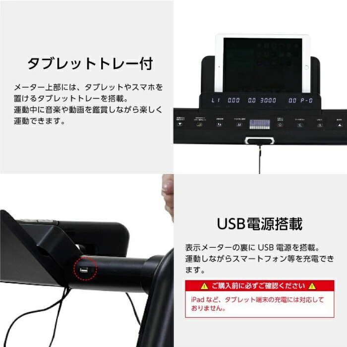 プログラムは12種類搭載!目的に合わせたトレーニングが可能です。USB電源を装備し、スマートフォンやタブレットの充電ができます。また、タブレットトレーが付いているので、映画やドラマを楽しみながら運動することもできます。