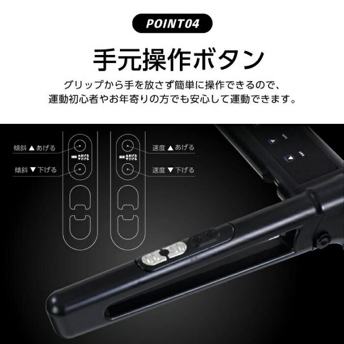電動で傾斜角度を調節でき、さまざまなトレーニングメニューが楽しめます。幅広くワイドな走行面が安定感を高め、快適なランニングをサポート。手元スイッチで簡単に操作ができ、スピードや傾斜を調整することができます。
