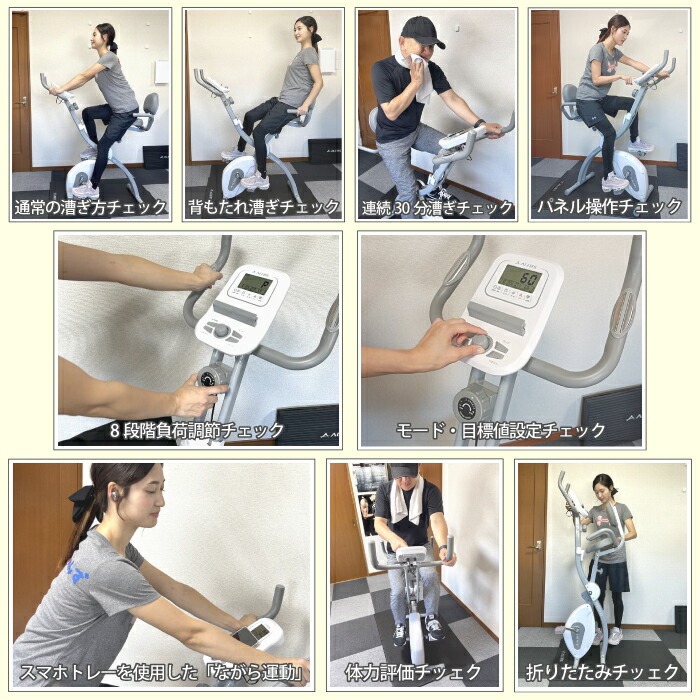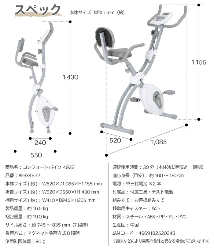 背もたれシートと可動式のサイドハンドル付きの折り畳み可能なフィットネスバイク「コンフォートバイク AFBX4922」は軽量コンパクト、心拍数測定できるトレーニングバイクです。
