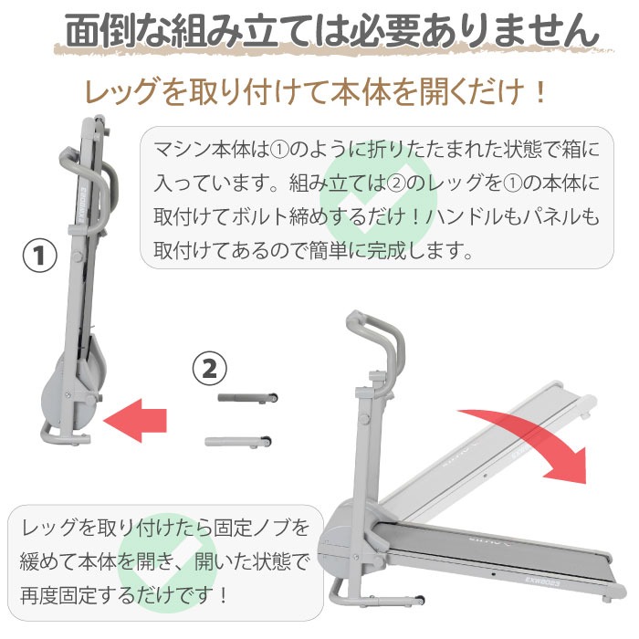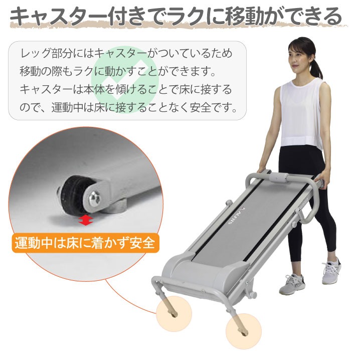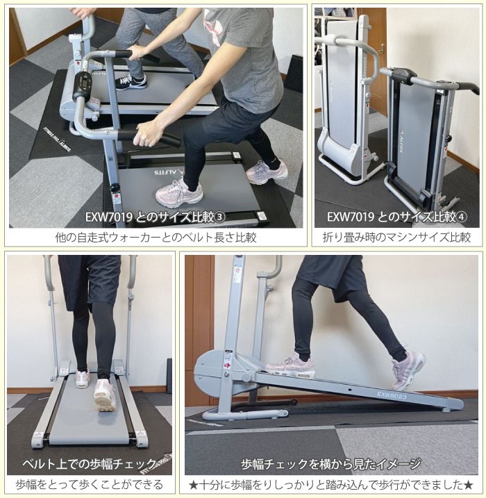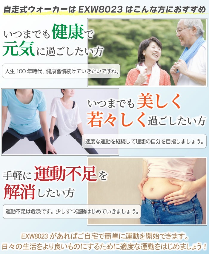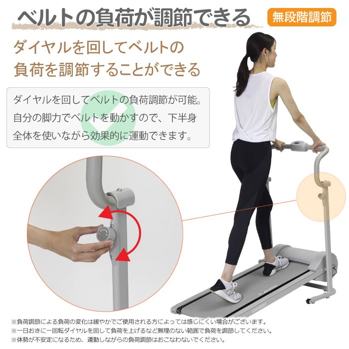 ベルト(歩行面)の負荷調節ができる自走式のウォーキング器具。プログラムウォーカーのように負荷の変化が大きくなく、取扱いも簡単でご高齢者の方や運動に不慣れな方も安心して「歩く」運動をおこなうことができます。ウォーキング運動はダイエットや健康維持に最適です。自宅・室内でできる自走式のウォーキングマシン EXW8023は電源不要で場所を選ばず運動することができます。 ■電動ウォーカーでの運動に不慣れ / リハビリ 目的 / 高齢者の方 / 運動不足の方も安心!自分の力で踏み込んでベルトを回すので、運動初心者でも安心して使用できます。 ■歩行面の傾斜角度が約9°あり坂道を上る感覚で効率良く消費カロリーアップ!短時間で効果的なウォーキング運動ができます ■静音&使用時間制限なし。モーターがないので運動音はとても静です。マンションやアパートなど、階下や時間を気にせずご使用いただけます。健康維持・ダイエットに、ご自宅でのウォーキングをはじめませんかEXW8023があなたの運動をサポートします!※EXW8023は歩行用です※※ランニングマシンとしての使用はできません※