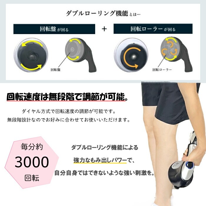 ダブルローリング運動(回転盤+回転ローラー)により、無段階調節の2つの回転運動がカラダに刺激を加えます。