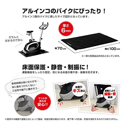| 商品特徴 | ・アルインコ製バイク適応サイズ ・静音性、床面保護、衝撃吸収、滑り止めに ・ストレッチやヨガマットとしても使用可能 ・収納用マジックテープ付属 |